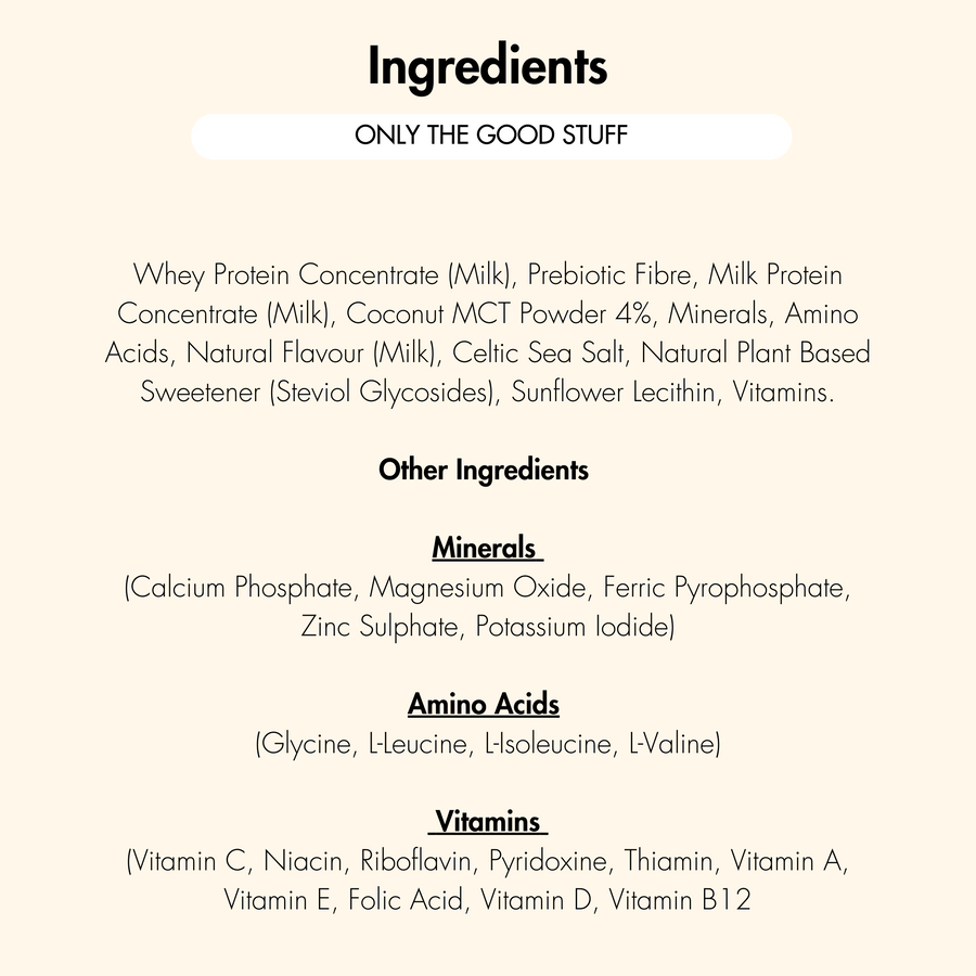 Whey Protein Concentrate (Milk), Prebiotic Fibre(Soluble Corn Fibre, Acacia Fibre),Milk Protein Concentrate,Coconut MCT Powder 4%, Minerals (Calcium Phosphate, Magnesium Oxide, Ferric Pyrophosphate, Zinc Sulphate, Potassium Iodide), Amino Acids (Glycine, L-Leucine, L-Isoleucine, L-Valine), Natural Flavour (Milk), Celtic Sea Salt,Natural Plant Based Sweetener(Steviol Glycosides), Sunflower Lecithin, Vitamins(Vitamin C, Niacin, Riboflavin, Pyridoxine, Thiamin, Vitamin A, Vitamin E, Folic Acid, Vitamin D, Vitamin B12)